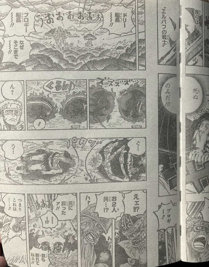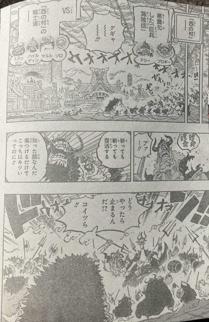 三人同时出击,弗兰奇一拳击中了梦魇怪物的脑袋,甚平一个人击中了梦魇怪物的腹部,山治直接一脚击中了麒麟戈姆圣的脑袋,他的泡泡球都碎了。弗兰奇把梦魇怪物的脑袋击碎,在西村,亚鲁鲁长老和巨人族战士正在对抗恶魔傀儡,东利和布洛基等人再次站起来了。